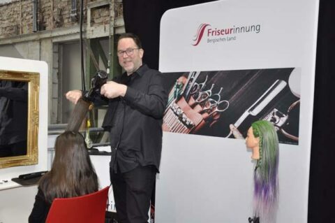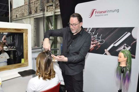 Friseurinnung Bergisches Land: Colour, Cut und Style standen an diesem Stand im Mittelpunkt. Ganz praxisnah hat Friseurmeister René Klos gezeigt, was zu diesem Ausbildungsberuf alles dazu gehört. Und dabei geht es nicht nur um das Äußere des Kunden, sondern auch um die Wohlfühlatmosphäre.