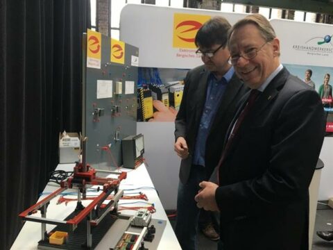 Elektroinnung Bergisches Land: Die Elektroinnung hat unter anderem präsentiert, was ein Auszubildender in diesem Gewerk leisten kann. Mensch gegen Computer lautet die Devise: Wer steuert den Kran schneller? Ein interessierter Messebesucher oder der Computer. Das Programm für den Dreiachsen-Roboter, der im Einsatz war, hat ein Auszubildender geschrieben.