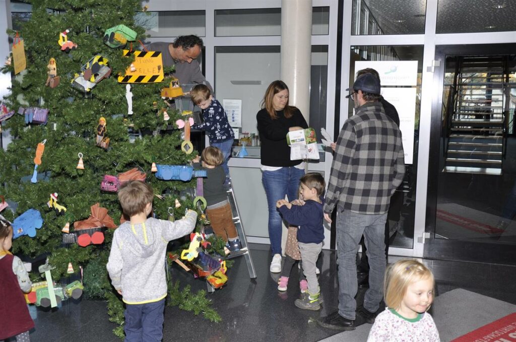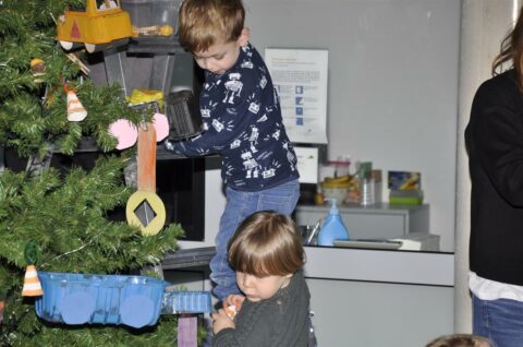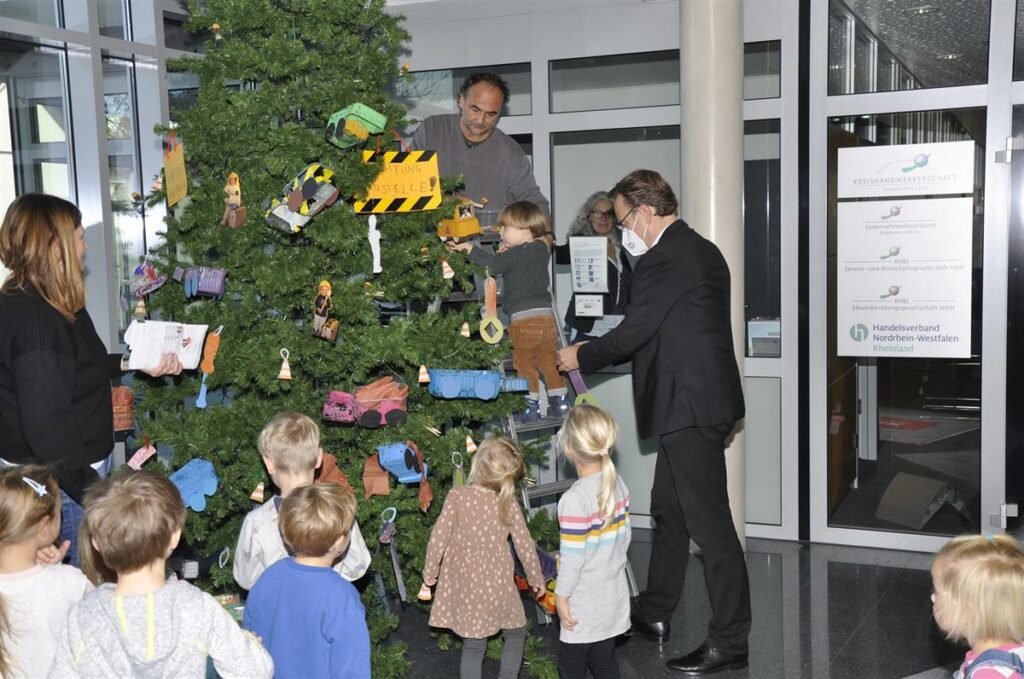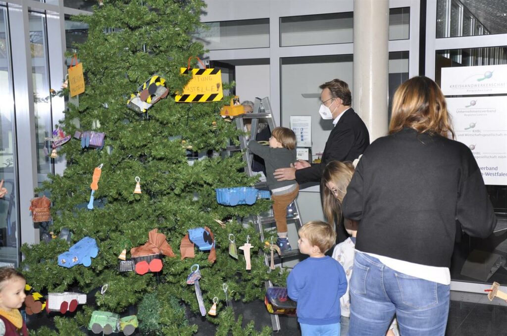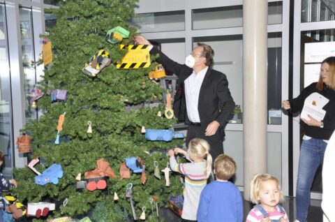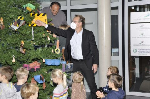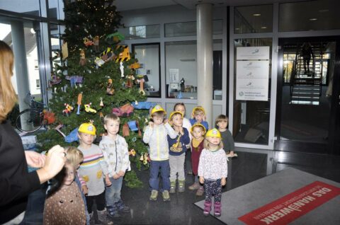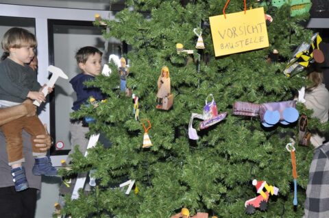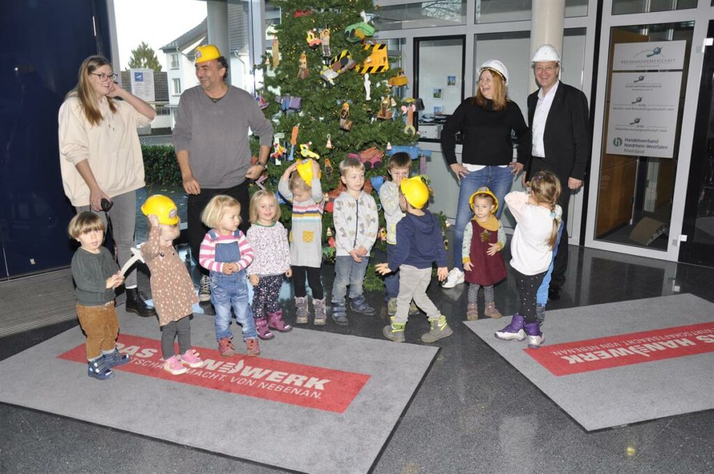 Am 23. November war es wieder so weit: Traditionell kommen vor dem 1. Advent unsere direkten Nachbarn, die Kinder des Kindergartens der AWO Kreisverband Rhein-Oberberg e.V. in Bergisch Gladbach-Schildgen zu uns. Dann wird unser Baum mit den selbst gebastelten Kunstwerken geschmückt. Die Kita-Kinder lassen sich in jedem Jahr viel Neues einfallen und alle warten gespannt darauf, was dieses Mal aufgehängt wird. In diesem Jahr haben sich die kleinen Künstlerinnen und Künstler von der Baustelle auf dem Parkplatz der Kreishandwerkerschaft inspirieren lassen: Neben LKW und Baggern aus bemalten Obstschalen hängen laminierte Fotos von den kleinen Handwerkern mit gelbem Bauhelm. Der gelbe Bauhelm in Form einer angemalten Nussschale findet sich auch auf einem kleinen Tannenzapfen wieder. Und natürlich darf das Werkzeug der Bauarbeiter nicht fehlen. Der Baumschmuck der Kindergartenkinder macht den Weihnachtsbaum jedes Jahr aufs Neue zu einem Unikat.
