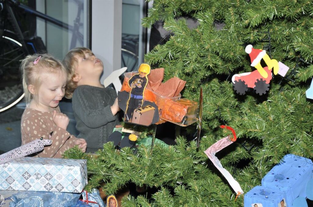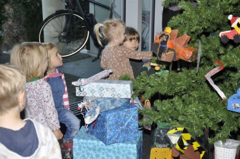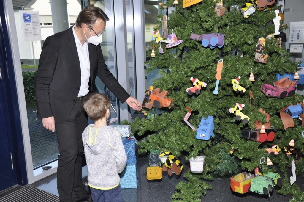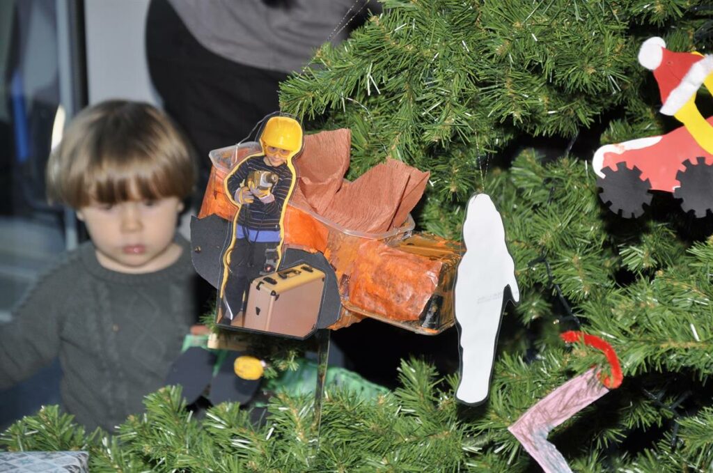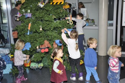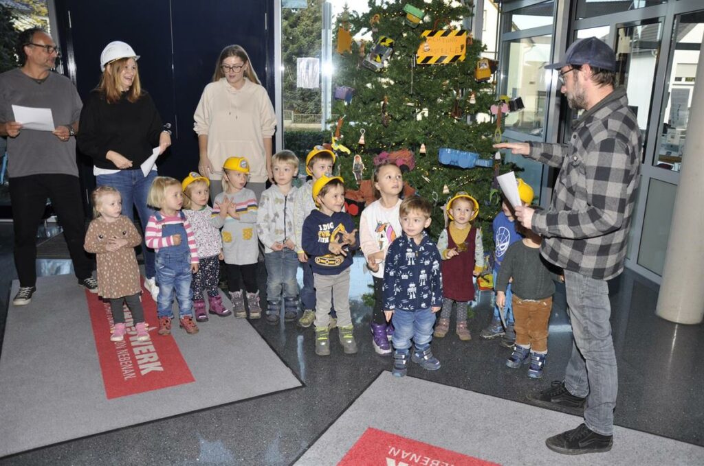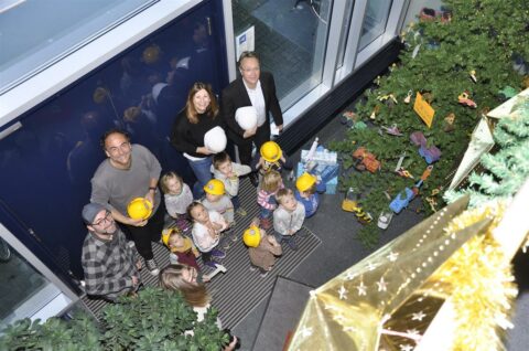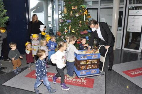 Am 23. November war es wieder so weit: Traditionell kommen vor dem 1. Advent unsere direkten Nachbarn, die Kinder des Kindergartens der AWO Kreisverband Rhein-Oberberg e.V. in Bergisch Gladbach-Schildgen zu uns. Dann wird unser Baum mit den selbst gebastelten Kunstwerken geschmückt. Die Kita-Kinder lassen sich in jedem Jahr viel Neues einfallen und alle warten gespannt darauf, was dieses Mal aufgehängt wird. In diesem Jahr haben sich die kleinen Künstlerinnen und Künstler von der Baustelle auf dem Parkplatz der Kreishandwerkerschaft inspirieren lassen: Neben LKW und Baggern aus bemalten Obstschalen hängen laminierte Fotos von den kleinen Handwerkern mit gelbem Bauhelm. Der gelbe Bauhelm in Form einer angemalten Nussschale findet sich auch auf einem kleinen Tannenzapfen wieder. Und natürlich darf das Werkzeug der Bauarbeiter nicht fehlen. Der Baumschmuck der Kindergartenkinder macht den Weihnachtsbaum jedes Jahr aufs Neue zu einem Unikat.