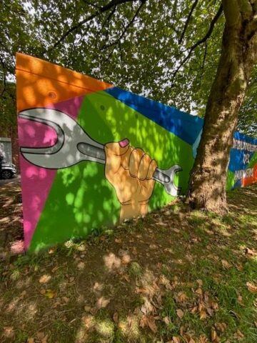 Dieses Jahr waren Ende August die drei Garagenwände am Berufsbildungszentrum in Burscheid dran. Innerhalb von sechs Stunden zauberten die fünf Azubis unter der Anleitung von Marc Roberz an die Comic-Kunst angelehnte Bilder passend zu den im Berufsbildungszentrum unterrichteten Gewerken: Maler, Kfz und Friseur. In kräftigen und knalligen Farben sind die Kunstwerke schon von weitem sichtbar. Nur am Anfang gab es eine kleine Einweisung von MR Graffiti und dann legten die fünf Azubis los – es wurde gesprayt, was das Zeug hält. MR Graffiti selbst zeigte sich von der präzisen Arbeitsweise der jungen Leute beeindruckt – die ruhige Hand, die einen absolut geraden Strich sprayt, ist keine Selbstverständlichkeit.