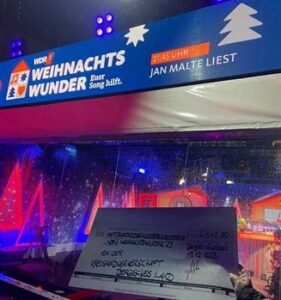 Zur Übergabe des symbolischen Spendenschecks fuhr stellvertretend für die Kreishandwerkerschaft Isabelle Schiffer, Leiterin Presse- und Öffentlichkeitsarbeit, am Abend (19.12.) nach Düsseldorf. Sabine Heinrich vom WDR2 Weihnachtswunder-Moderatorenteam holte Schiffer spontan ans Mikrofon und damit live in die Sendung und bedankte sich ausdrücklich und ganz herzlich für die großzügige Spende von der Kreishandwerkerschaft Bergisches Land in Höhe von 4.349 Euro: „Ihr seid echt der Hammer! Das ist so toll – dankeschön!“, so Heinrich.