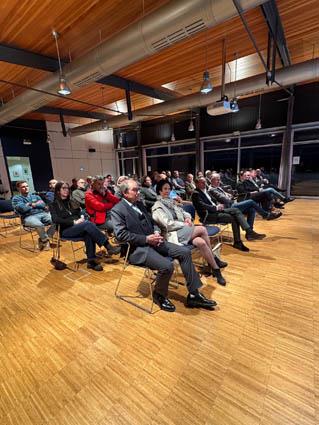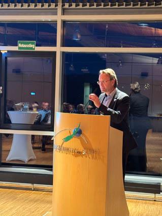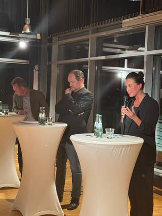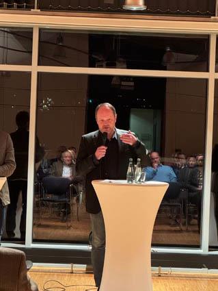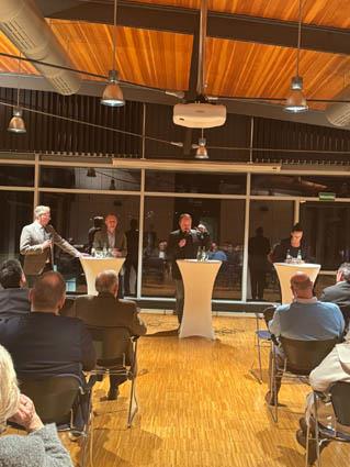 Die beiden Moderatoren, Dr. Oliver Schillings und Fred Busen, stellten die drei Politiker vor und leiteten dann direkt über zu einer Videobotschaft von Christian Lindner (FDP), der an diesem Abend nicht dabei sein konnte. Bei der anschließenden Diskussion ging es um die Themen Energiepreise, Bürokratieabbau in Verbindung mit Vertrauen in die Politik, Infrastruktur, Mobilität und Finanzierung sowie den Fachkräftemangel.