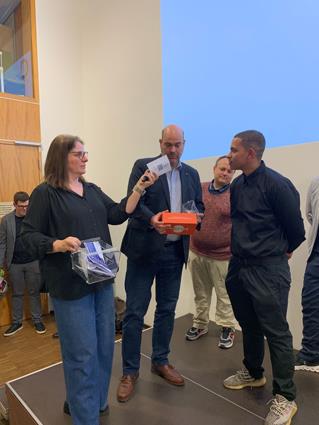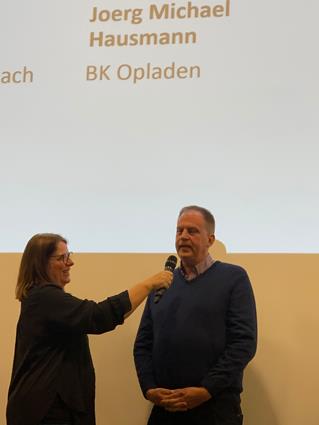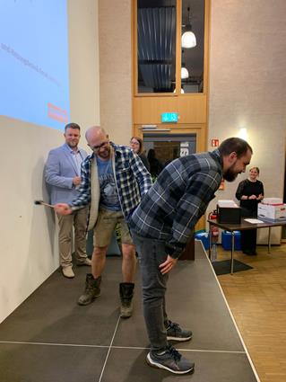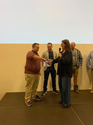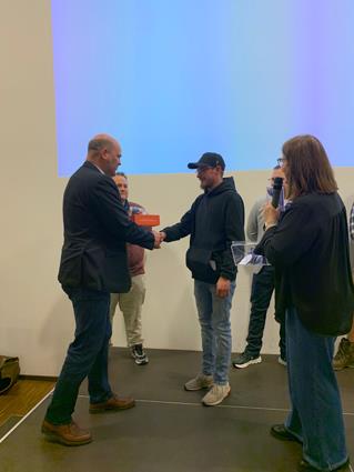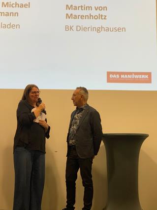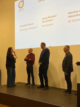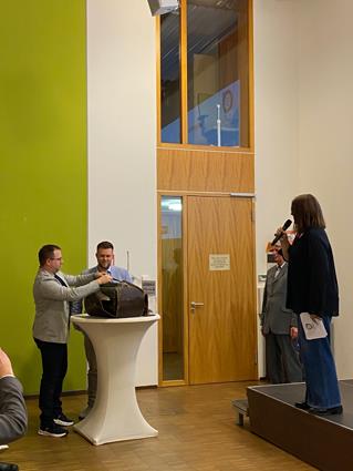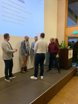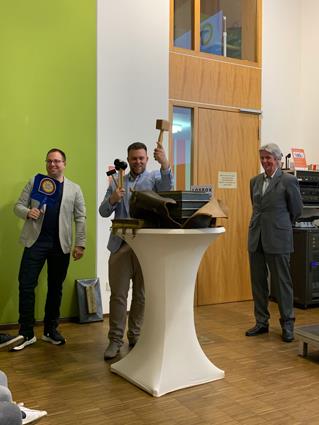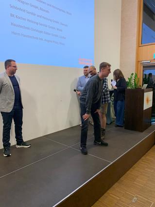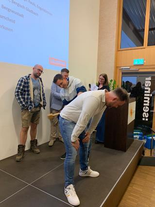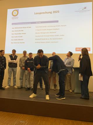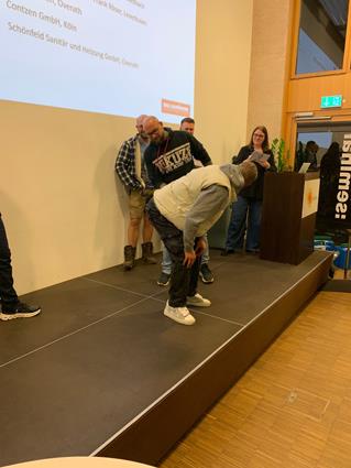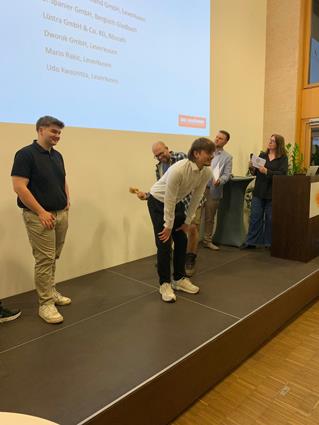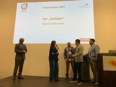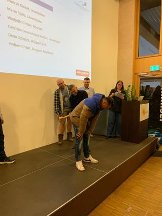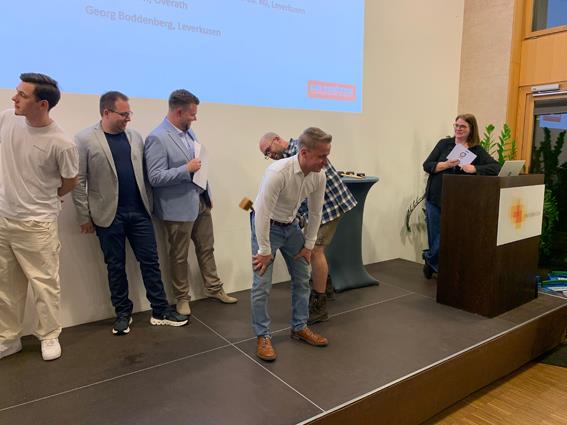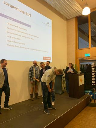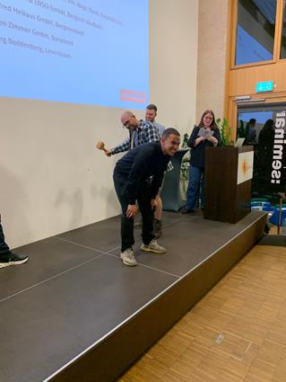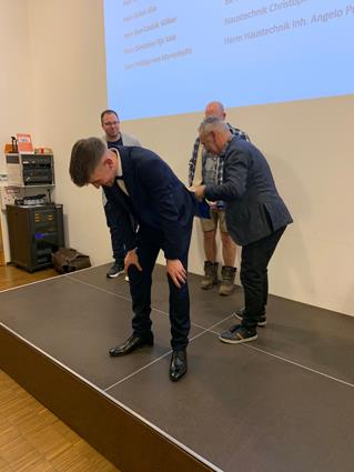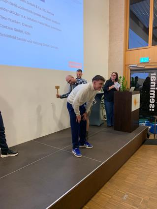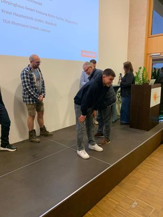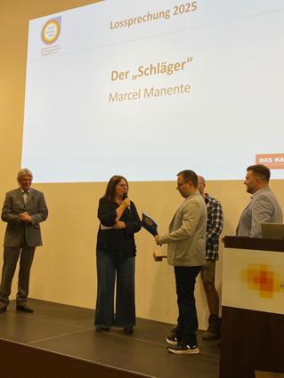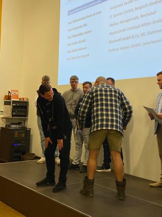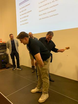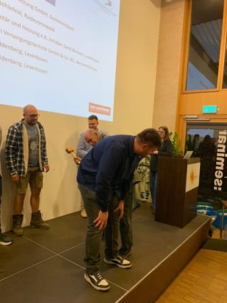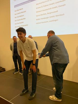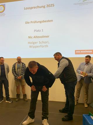 Beglückwünscht wurden sie auf der Bühne von den Lehrlingswarten Daniel Scholz und Andreas Sieberts sowie vom Obermeister Thomas Braun und dem Vorstandsmitglied Marcel Manente, der an dem Abend das Losschlagen übernahm, wenn sich kein Meister oder Familienangehöriger fand.