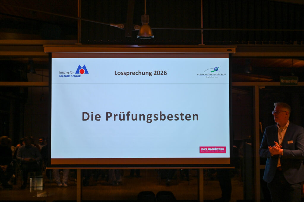 „Die Lossprechung ist eine alte Tradition im Handwerk. Früher bedeutete es, dass der Lehrling von seinem Meister losgesprochen wurde, seinen Weg frei zu gehen, Verantwortung zu übernehmen und sein Können unter Beweis zu stellen. Genau darum geht es heute auch noch: Ihr steht jetzt nicht mehr am Rande der Werkbank, sondern mitten im Handwerk – als Fachkräfte, als Könner, als Träger einer stolzen Tradition“, eröffnete Ingo Eiberg, Lehrlingswart der Innung für Metalltechnik Bergisches Land, seine kurze Rede.