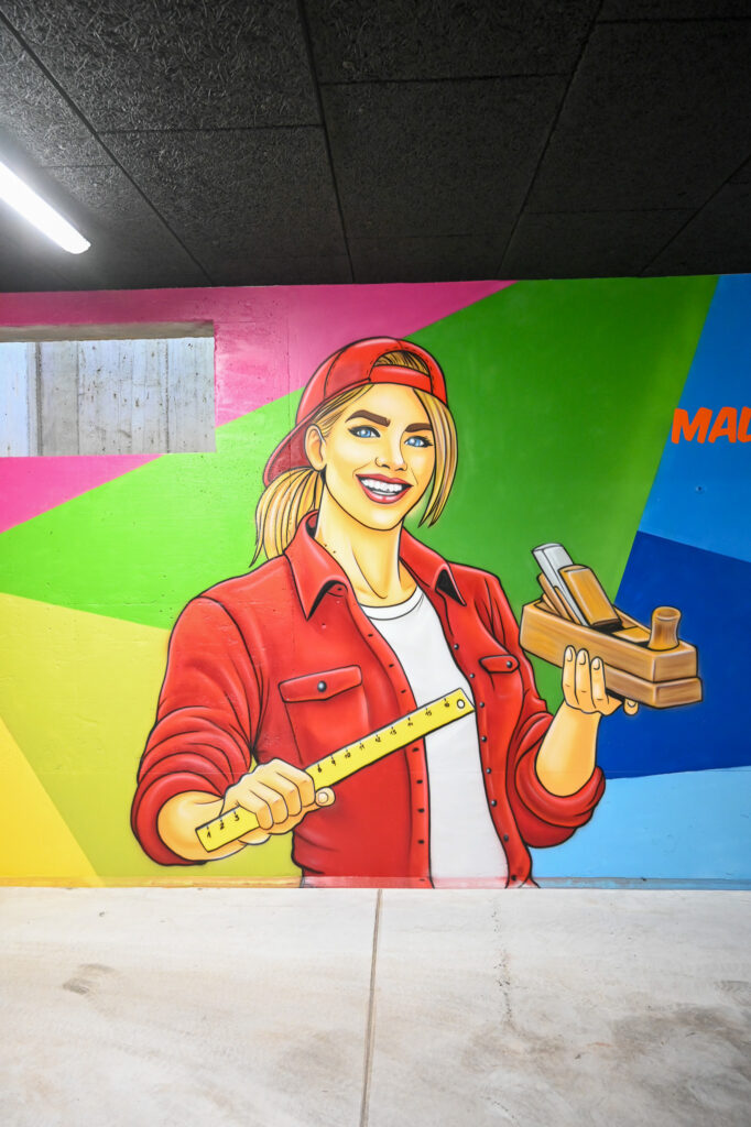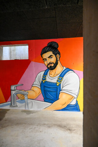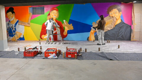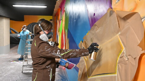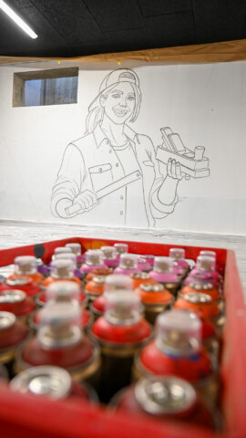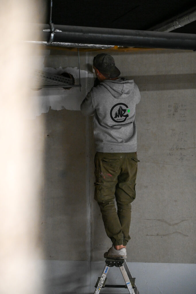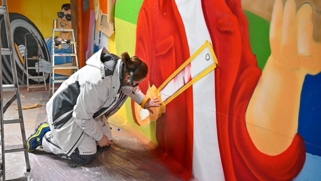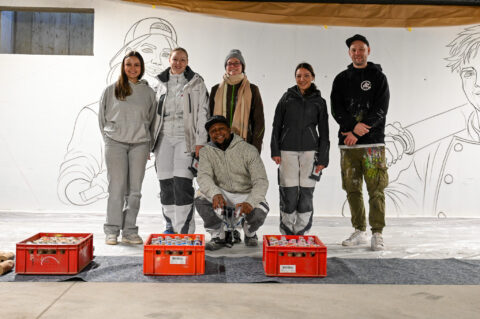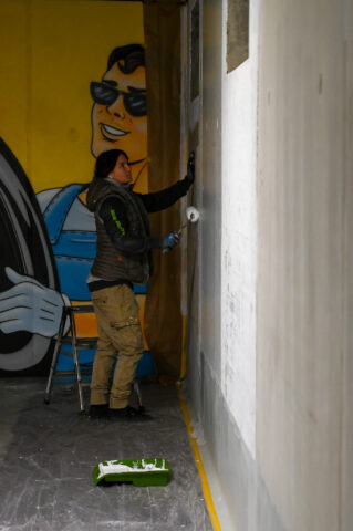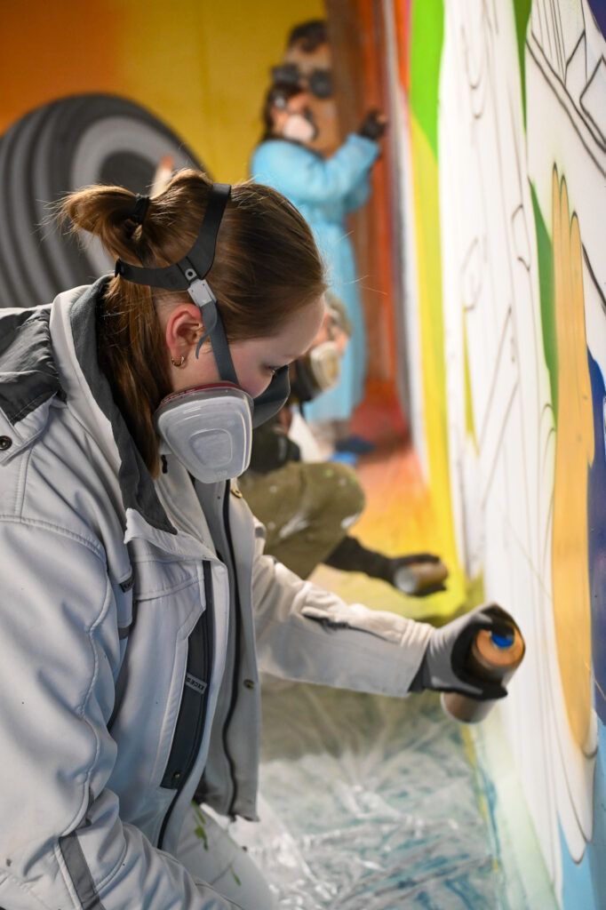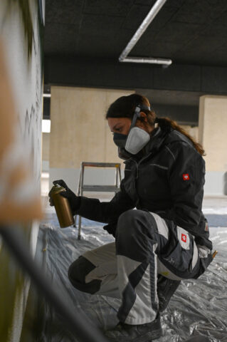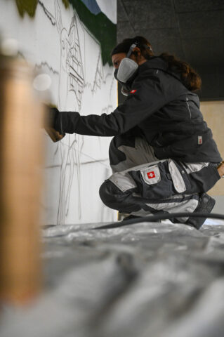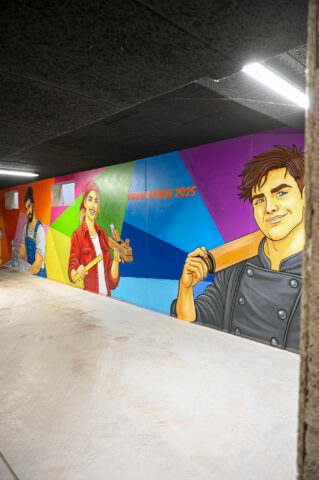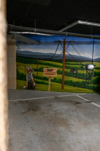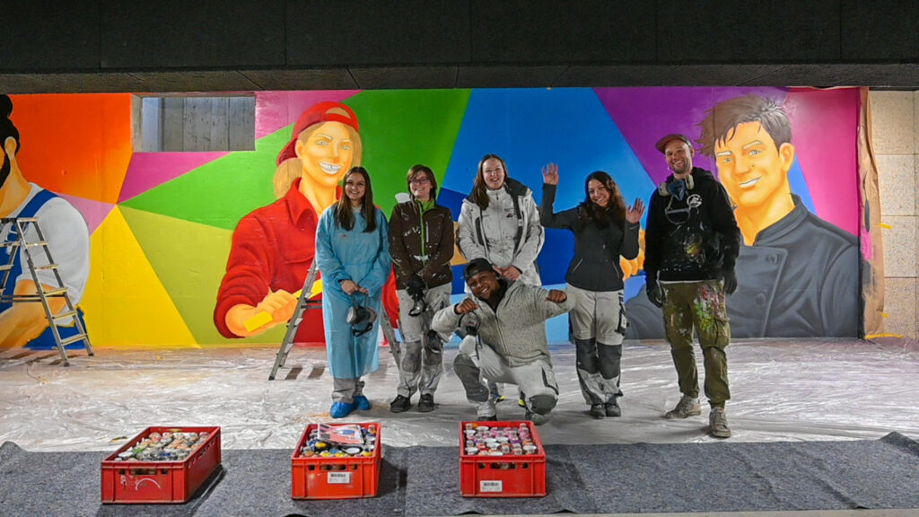 An einem Samstag Anfang Februar griffen fünf junge Menschen zu Spraydosen und zauberten zum zweiten Mal in Folge auf einige Wände in der Tiefgarage unter dem Neubau der Kreishandwerkerschaft Bergisches Land Handwerksberufe wie Bäcker, Tischler und Anlagenmechaniker für Sanitär-, Heizungs- und Klimatechnik. An einer weiteren Wand ist eine Bergische Landschaft mit u.a. einem Reh und einem Fuchs – beide täuschend echt – entstanden.